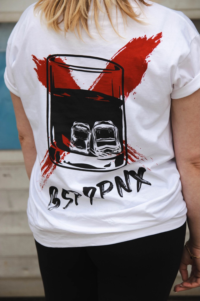 BSPRPNX-Shirt in weiß mit kleinem Aufdruck vorne und großem Druck hinten.